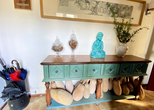 现在的“百廿间”各处厢房均已为根雕、古玩、字画、非遗、养生茶、奇石、翡翠、麦秆画、汉服、轩辕黄酒、戏曲文化、十里红妆婚嫁民俗馆等乡村文化的展示地。游览间巧遇当地书法大家江南山人,获赠“室雅兰香”横幅,荣幸之至。