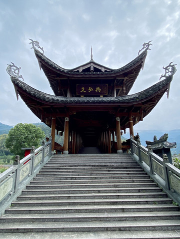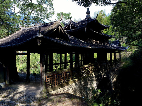 双溪桥在小梅镇孙坑村,横跨青溪,于民国二十一年(1932)建,简支悬臂式木梁廊屋桥,单孔,跨16米,桥长45米,宽4.5米,桥屋11间,中部桥心亭,三重檐歇山顶,翼角起翘,内施藻井,设神龛,非常精美。