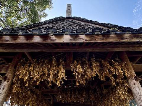 路过马坑,来到了月下桥,桥在村子中间,不大,建于民国元年(1912年),桥上被村民堆满了收割的毛豆之类的作物,成了晾晒场地。