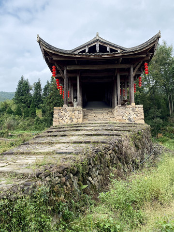 来凤桥建于清道光十八年(1838年),由石拱券、廊屋构成,拱跨15.5米,矢高5米,整个拱券呈半圆形,相当厚实稳重。廊屋全长30米,有廊屋11间,面阔三开间6米,当心间西南侧设神龛,桥面铺设块石,梁架上留有多处“文革”时期的墨迹。桥边遇到村民告诉我们,桥边的石台阶是初建时的原物,廊屋这些都是历代整修过的。