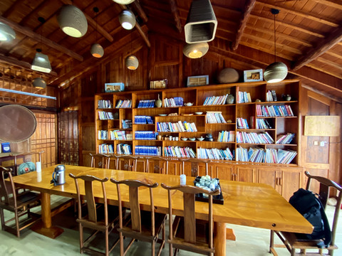 悬崖上的先锋书店创立于1996年,是用50多年前村里修建的村民礼堂改建的,布局朴实精美,西南向的台地上增加了3米见方的体量,作为书店的休憩和观景平台,可以一览村内的山峦风光,曾多次入选国际媒体世界最美书店,确实不错。逛了一圈之后,觉得书店文创的黑色咖啡杯有点意思,果断买了一个。