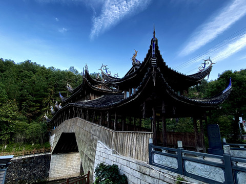 济川桥在东书村村尾,清光绪十五年(1889)建,为一墩双孔木梁屋桥,跨溪23米,桥长32.32米,宽4.32米,屋面单檐双坡顶,中部三间为重檐歇山顶,当心间南面设神龛,供真武大帝。