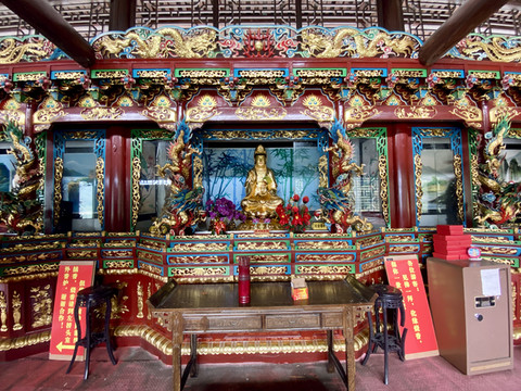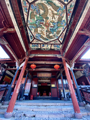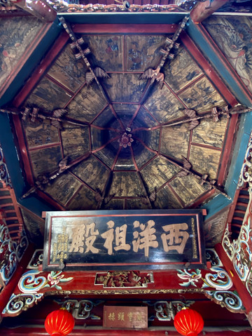 溪东桥边,静静伫立着一座充满历史韵味的古建筑——泗溪临水殿,殿内供奉陈十四娘娘——即顺天圣母陈靖姑。临水殿始建于明万历三十七年,光绪二十三年扩建,整个建筑雕梁画栋,工艺精细,古朴优雅,令人惊叹的大殿藻井,分七层而上,每一层都有着不同的图案和装饰,彩绘、浮雕并用,犹如一朵盛开的莲花,精妙绝伦,莫不是寓意七级浮屠?