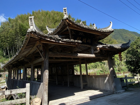 福善桥坐落在上南坑村尾水口,始建于清道光三十年(1850),为单孔石拱屋桥,净跨7.6米,矢高5米,桥长23.1米,面宽3.69米。当心间升起,重檐歇山顶,桥中间为神龛,供观音、平水王、土地公像。桥边一侧空地上建有“逥龙寺院”,门上锁了,门神彩绘精美。