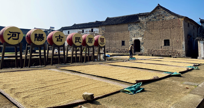 进入村口,有一片巨大的广场,有村民正在晒谷,场上竖着6个大鼓,河阳古民居五个大字和徽标格外醒目。