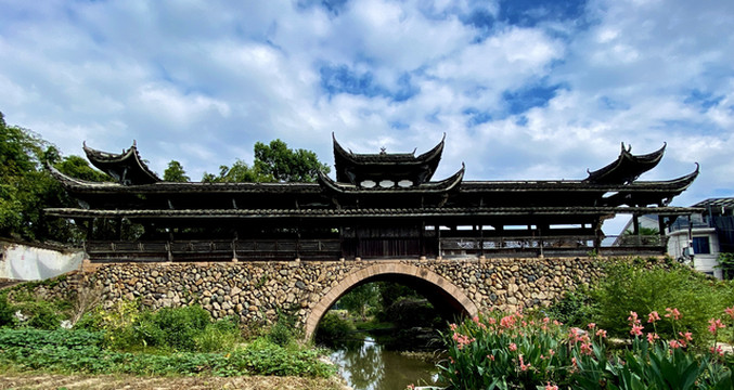 来到章坑村,在村中文革时期建造的大会堂正对面,就是怀胜桥,又称路龙桥,始建年代不详,桥梁上记载为大清光绪元年(1875年)修建,桥长28米,高4米,单孔平卧,桥体两侧重檐翘角。