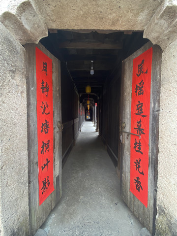 不一会来到村中心一处池塘,此时太阳有些高了,水面倒影着一整排白墙黑瓦的马头墙,甚是壮观,映衬出老旧木门上星点红色的“福”符尤显强烈。