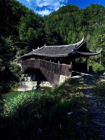 半路亭桥在庆元陈边村,始建于元至正年间,于清嘉庆二十三年(1818)复建,民国三十六年(1947)重建,长28米,宽4.9米,拱跨21.2米,拱高5.2米。中心间重檐歇山顶,南面设神龛,供奉观音像。整桥在青山绿水和黄土黑瓦的映衬下,呈现出一种独特的古朴美。