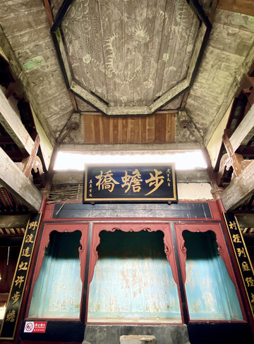 步蟾桥是月山村最壮观的桥,单孔石拱雄跨举溪,静静伫立在空旷的田野之中,此桥始建于明永乐年间,民国六年(1917)重建。拱券半圆形,跨16.4米,矢高8米。廊屋长50.2米,18间,面阔5.2米,当心间和东西桥头各一间重檐歇山顶。当心间施八角藻井,内设神龛。