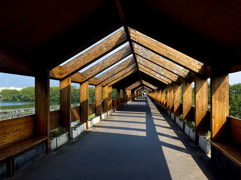 离开界首转回松阳,来到横架松阴溪的一座独特廊桥-----石门圩廊桥,说到独特只因其不是老的木结构传统廊桥,前身是建于1974年的无筋无肋混凝土双曲拱桥,2012年底几乎废弃,2016年松阴溪景区建设才给此桥带来生机,由北京DnA建筑事务所接手了这座大桥的改造。采用木装配结构,廊桥沿着263米的大桥展开,在桥拱处廊顶开放,呼应大桥的结构韵律,也形成线性路径上光影交错的节奏。桥中央放大的平台,保留了上世纪70年代建桥时的石刻栏板,桥的照明设计拿下第36届国际照明设计奖。可惜我们去的是白天,未能一睹夜晚灯光风采,也没遇上周日热闹的桥上集市,留点遗憾。