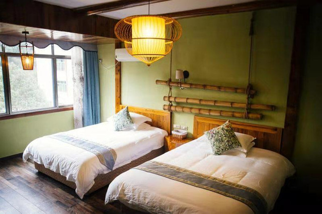 客房装饰的风格偏向现代风,同时融合了一些古老守旧的中式元素在其间,昏黄的暖灯之下,烘托的房内更加温馨安逸。