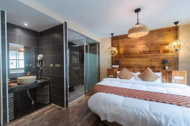 客房内设有独立的卫浴,并且一应基础生活设施非常齐全,在这里的日常所需全部都有,隔着窗户就能看尽周边的村庄、山水风景,特别适合居住度假。
