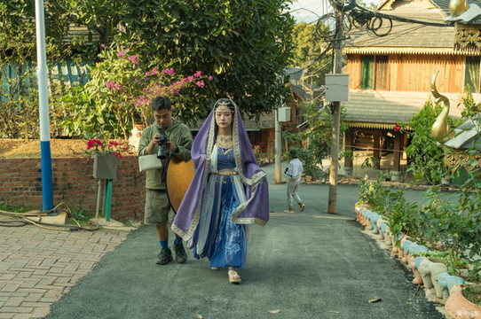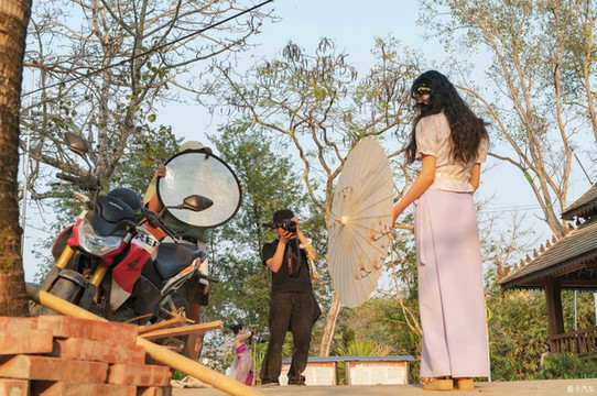 曼贺纳在傣族村寨拍摄写真的各种小组。