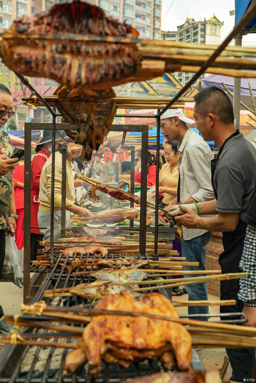 曼贺纳的赶摆,正宗傣族的烧烤总是不断诱惑着游人。曼贺纳矗在榕林大道上的寨门,远比很多傣族自然村寨阔绰,这得益于城中自然村的稀罕性为其打call。
