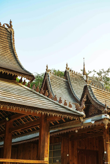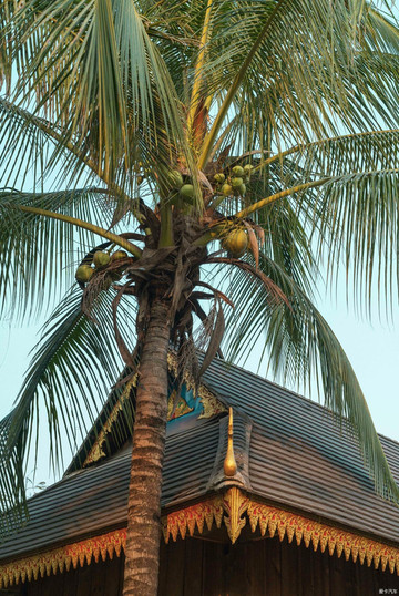 掩映在椰林旅人蕉菠萝蜜热带花卉中的这一古寨,几乎清一色傣族吊脚楼,均为两层栏杆式民居,绝大多数是木楼,屋顶为歇山顶式瓦片风格,屋檐和房顶,分别装饰着傣族的金、银和绛红色图腾。最原始的傣式竹楼和茅草屋顶款式,仅有两三栋象征性地存在。