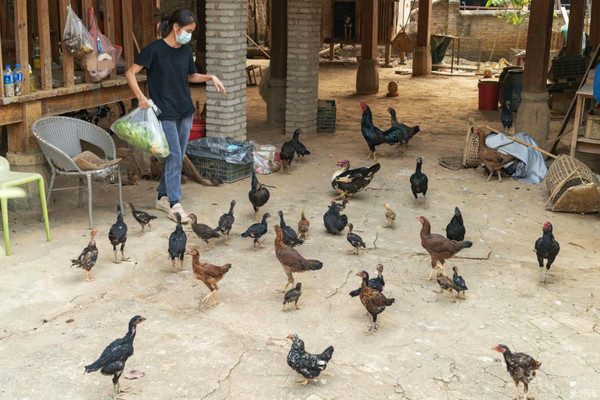 曼贺纳古寨,一些民居做民宿客栈饭馆,一些民居则专养傣族土鸡。