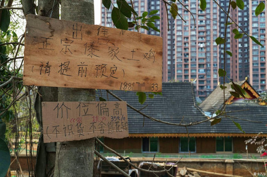 曼贺纳古寨里,这家村民在院墙旁大树上安民告示:他家的鸡喊醒35元一斤,不识货、不舍得花钱,勿扰。
