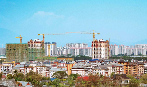 图片远处的曼贺纳新村与近处的古寨,建筑风格迥异。