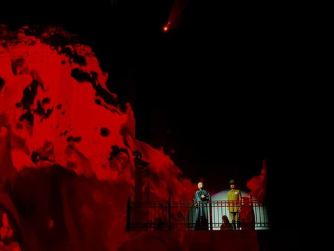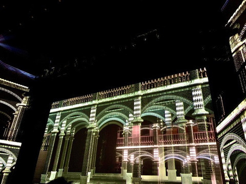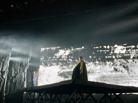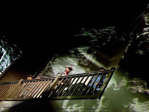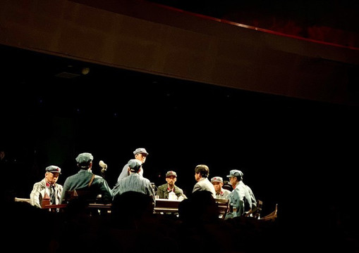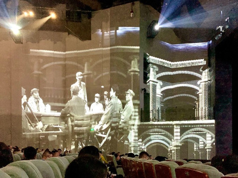 我对交互式舞台剧的理解就是不只是观看正前方的表演,这个剧在我们观看席中间都有一个小小舞台,观众席两侧楼上也有表演舞台,演员一会儿在正前方的大舞台上表演,一会儿需要我们抬头看楼上左侧和右侧,一会儿又需要我们往后转看后方,当然后方观众席里的表演是有投影仪投射到正舞台前方的。总之,观看这一场演出,还顺便活动了我的颈椎筋骨。