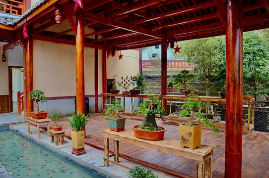 在这里除了观赏盆栽,还可以住特色民宿。遵义盆景小镇里有14家庄园,由当地村民自住房改建而成,家家院落里都陈展盆景艺术作品,以盆景参观、小微盆景制作、特色餐饮、特色民宿为方向,能提供床位200余张,推出柴火鸡、八大碗、生态鱼、私房菜等特色美食。