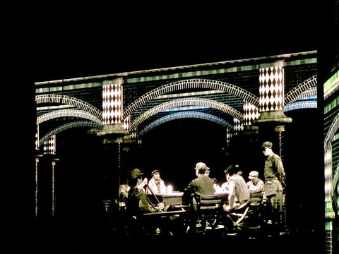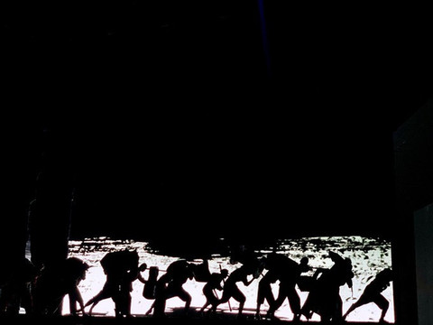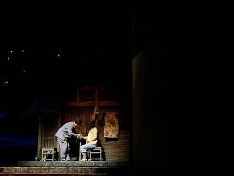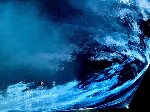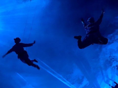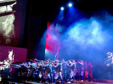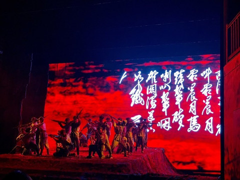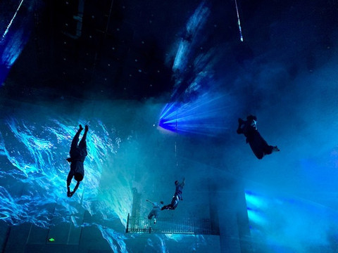 在表现红军四渡赤水时,也让整个舞台沉浸在一片蓝色“海洋”中,红军吊着威压在观众席头顶上空盘旋,表现在水里挣扎游泳的场面。