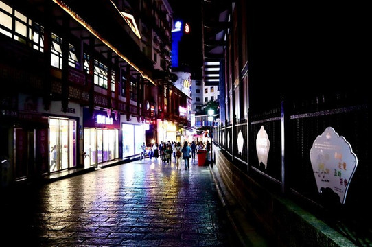 街心一律青石板铺地。沿街灯箱上的画面,均是红军长征途经地方的照片。