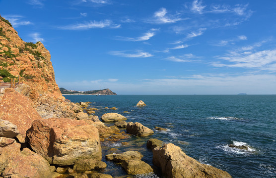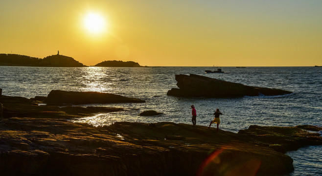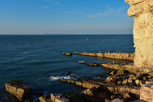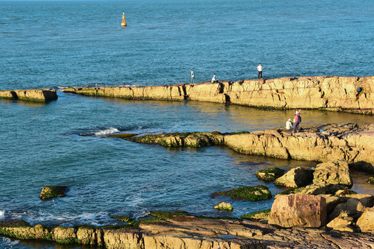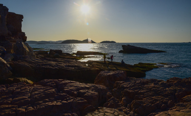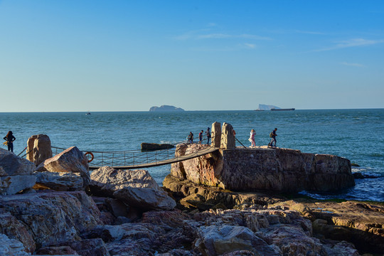 过九丈崖,眼前的海岸与平静优美的月牙湾、鸥翅湾相比,更加俏皮有趣。一大堆各具异象的石头集聚岸边,有的像一把巨大的利剑,斜插入海;有的如一艘小型炮艇,劈波斩浪;还有的是天生的桥塔,敦厚稳重。更多的礁石难以名状、任凭想象。在这些石头上行走跳跃,似乎又回到了少年顽劣的快乐时光。