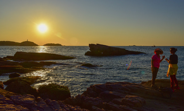 太阳向着西边两座岛屿之间的海平面加速靠近,射出越来越红的光芒。接近海面的云层太厚,挡住了太阳西沉入海那一刻的瑰丽辉煌。太阳在云层里挣扎着发出最后的光芒,然后沉入海中,在天边留下一片灿烂红霞。