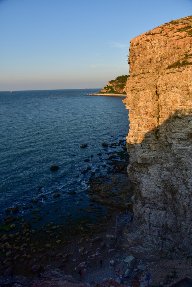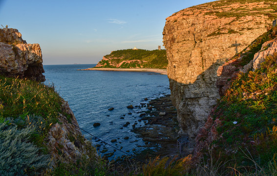 长岛四面环海,线条优美的海湾沙滩俯拾皆是。刚离开半月形的月牙湾,又见到了鸥翅湾,从高处看,蓝色海水和金色沙滩亲密拥抱,吻出一个硕大的海鸥展翅图案,线条流畅,浑然天成。鸥翅湾三个字刻在石碑上,很新,我猜是旅游开发商起的名字。从鸥翅湾收回目光往前看,就是北岛最负盛名的九丈崖。海岸边突兀而起一座垂直高崖,上凸下凹,人行其旁,会产生一种压迫感。抬头看,崖壁龇牙咧嘴,不由得加快脚步,快速通过。
