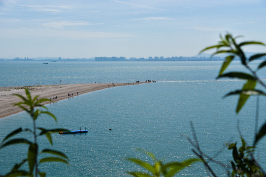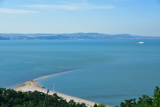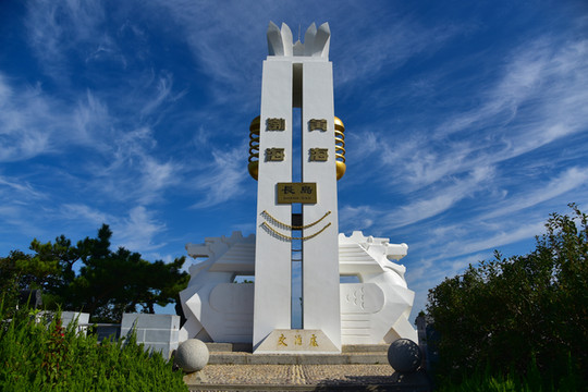 走到林海最高处。黄渤海分界线标志碑通体洁白,玉树临风。碑座两条白玉龙,应是黄海渤海两龙王,龙首各朝东西,看管着自己的领海。碑身两根高高耸立的洁白石柱并排而立,直指蓝天;东西两边柱身上各用黄铜镶嵌着“黄海”“渤海”四个大字,一块写着“长岛”的铜匾将两根石柱连在一起,寓意简洁明了。俯瞰黄渤海,长山尾由粗及细、呈弧形甩入海中,轻松潇洒一分两海。东边黄海蔚蓝,西面渤海微黄。若遇两海汹涌,黄海潮流向西,渤海波涛朝东,潮头对立,泾渭分明。今日海平波宁,黄渤两海和谐难分。