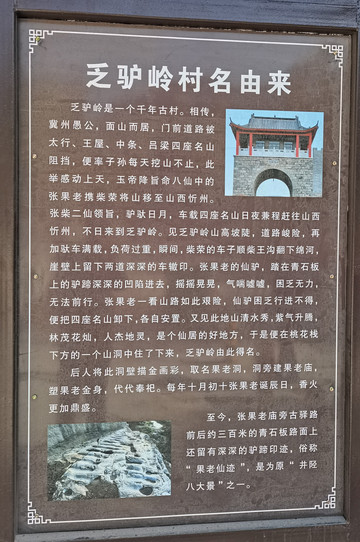 乏驴岭名字的由来,传说与张果老有关,村头立起一座张果老倒骑毛驴的塑像,作为乏驴岭的标志。至于民间传说中,故事演绎的更为生动:张果老和柴荣驴驮日月、车载名山,前往忻州,途径此岭,驴困车覆,因此有了乏驴岭这个村名。