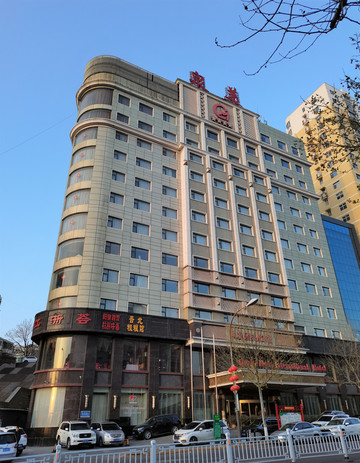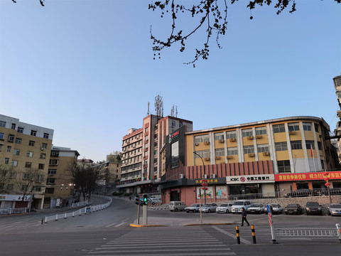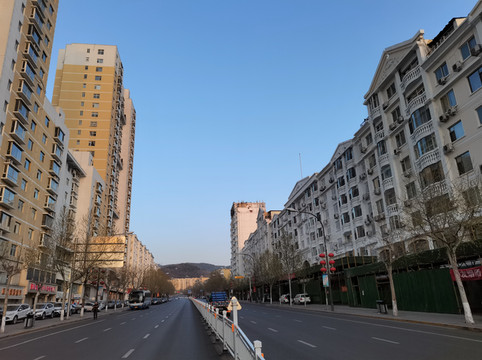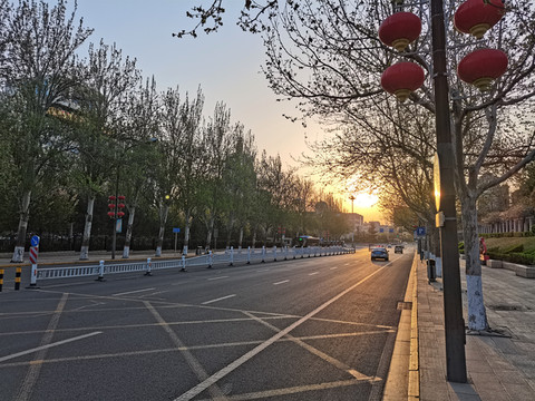 泉美酒店门前为南大街,上下6车道,应该是市区的一条主要街道。6:20,旭日东升,霞光满天。