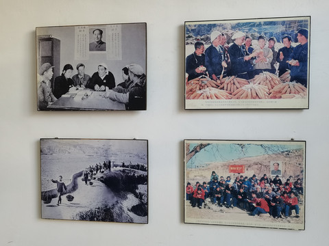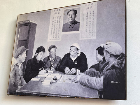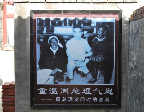 一家农家饭店,窑洞墙上的大幅照片是毛主席与陈永贵握手。陈永贵是大寨村支部书记,出生于1914年,新中国成立后,他先后任山西省昔阳县大寨村的生产委员,大寨村支部书记、大寨农业生产合作社主任。
