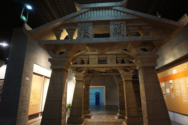 南朝陵墓石刻中的神兽和神道柱的复原展示。