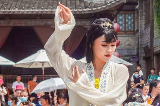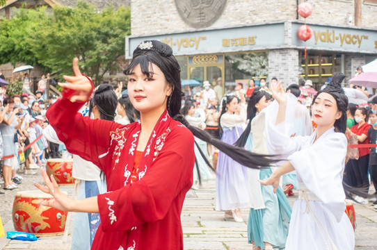 比如 在古戏台的一场古风快闪,演员们会穿上传统服饰在街头进行表演,在当今流行的各种音乐下歌舞。