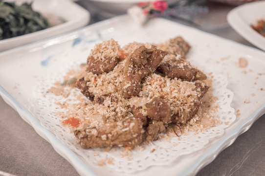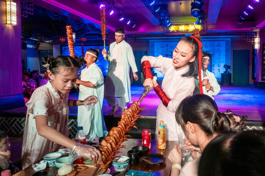 分量是按照每桌6人份均分的,大酱骨、大肉包等等这些看着还好,等到大鹏展翅上桌的时候就更为有趣了,在演员的表演中,把烤好的鸡翅串在剑上,然后上到每个桌前,非常酷嘞!