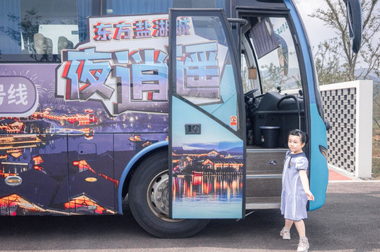 巴士有两条线路,车身还特别绘制了彩色宣传标语,小侄女迫不及待想上车抢个好座位。