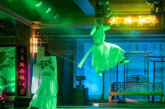 比如 古墓派表演的就是睡绳索!当然并不只是睡,当看到演员在一条绳子上上下摇摆的时候,整个人都心惊胆战。