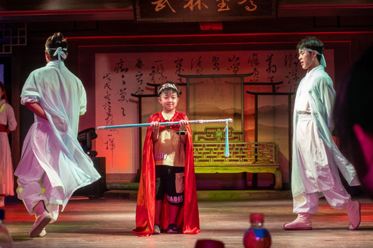 每个帮派都会请出一个代表进行游戏比拼,最终获胜的帮派会推举出一位来当武林盟主。我们这场最终是武当派获胜,然后这个小孩子就被推举了上台,非常有趣。
