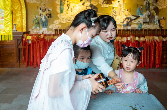 带着孩子们先去百业神殿这里测测运气,最好的方法就是求签了。因为小孩子的力道不好控制,所以就说抖一抖看看,把露出最长的那根当作求中的签。旁边就有公告牌来解签。