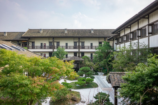 我喜欢这家酒店的庭院,铺满了白色石子庭院,种植者各种松竹,搭配着粉墙黛瓦的建筑,像是置身一幅水墨画中。