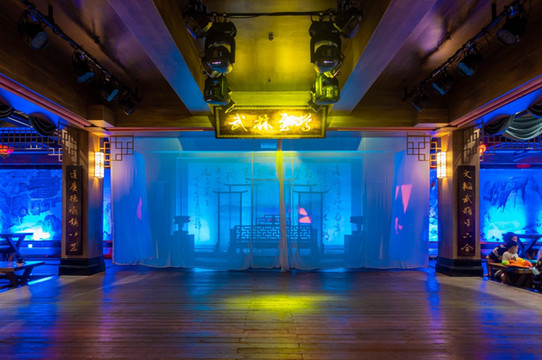 进入餐厅就能看到主舞台,而且游客被分成了武当、峨眉、丐帮、五毒、摩尼、古墓六大帮派,分别在各自区域用餐,总共可容下300人的大型餐厅。