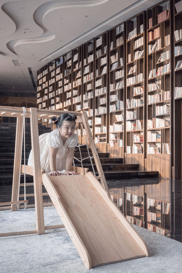 而且就在前台的旁边,偌大的阶梯旁有超大的书架,摆满了各类书籍。很多的儿童类书籍让心心充满了兴趣,在玩累了的时候刚好可以在这里看看书休息下。