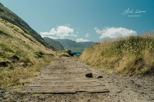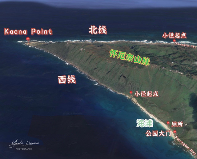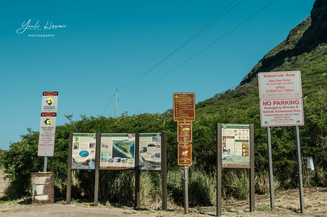 Kaena Point Trail西线的起点位于欧胡岛西岸怀厄奈/Waianae一侧Farrington Highway公路的尽头处。与之相邻的海滩是Keawaula Beach ,这是欧胡岛西岸最北端的一个海滩,同属Kaena Point State Park管理,海滩配有救生员、停车场、厕所以及淋浴设施。Keawaula在夏威夷语里的意思是红色港口,因附近水域的大量鱿鱼而得名,鱿鱼在繁殖期会呈红色状态?。而Keawaula Beach所处的海湾名叫横滨湾/Yokohama Bay,由20世纪初岛上到此钓鱼的日本裔渔民所取。