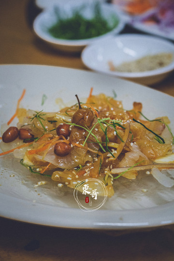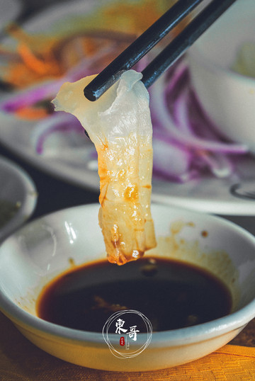 每片鱼肉薄如蝉翼,晶莹剔透。搭配上酱料后,咸香可口,回味无穷。鱼皮的部分则是爽滑弹牙,十分劲道。最特别的是师傅会单独切上一盘鱼腩肉,配合酱油和芥末,和吃日本生鱼片的方法一样。那口感软嫩劲道,冰凉爽滑,真是超级惊艳!