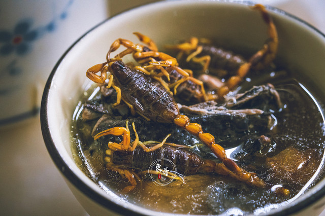 先尝了口汤头,党参与乌鸡煲制的汤底鲜美可口。捞出一只蝎子,鼓起勇气吃了一口,发现也没什么特别的味道。经过煲煮后,蝎子口感略软烂,不过还是有硬壳的地方需要咀嚼。整碗喝下神清气爽,格外过瘾。
