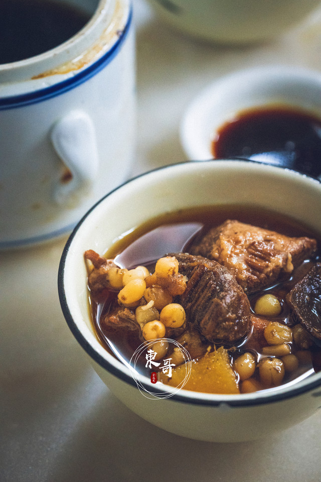 川贝罗汉果炖展肉,展肉就是猪腿上的肌肉,也叫猪腱子肉,用来煲汤口感爽滑。搭配川贝和罗汉果,清热润肺,止咳祛痰。特别是罗汉果的滋味融在汤中,口味微酸,解腻去油,非常特别。
