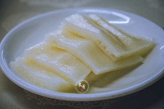 伦教糕是一种由米粉制成的传统糕点,起源于顺德的伦教镇,因此得名。蒸制好的伦教糕以晶莹洁白著称,在阳光下呈现透明的色泽,糕身有均匀有序的孔眼,质地软韧,味道甜冽而清香,有一种天然去雕饰的曼妙。