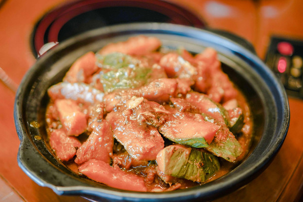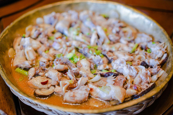 铜盘蒸鸡,蒸的做法最大限度保留了鸡肉的鲜美,闻到那浓郁的香味就已经让人垂涎欲滴,肉质细嫩却略有嚼头,食之口齿留香,爽滑鲜嫩的口感让人回味无穷,用当地话来说,就是“非常有鸡味”!