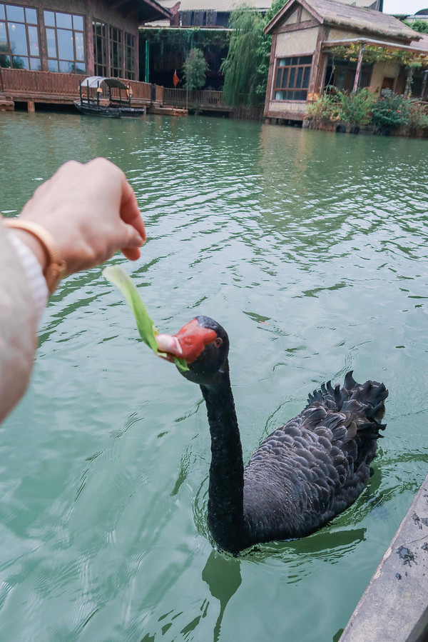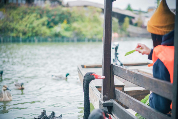 游船穿行在河面上,天鹅、鸳鸯、鸭子等动物会跟着游在游船两侧,我们不仅能近距离观赏,还可以拿出它们最爱的青菜投喂它们。可别看它们温温顺顺、可可爱爱的样子,它们的嘴巴非常有力,随便一啄,一整条菜叶子便被撕扯下去了。